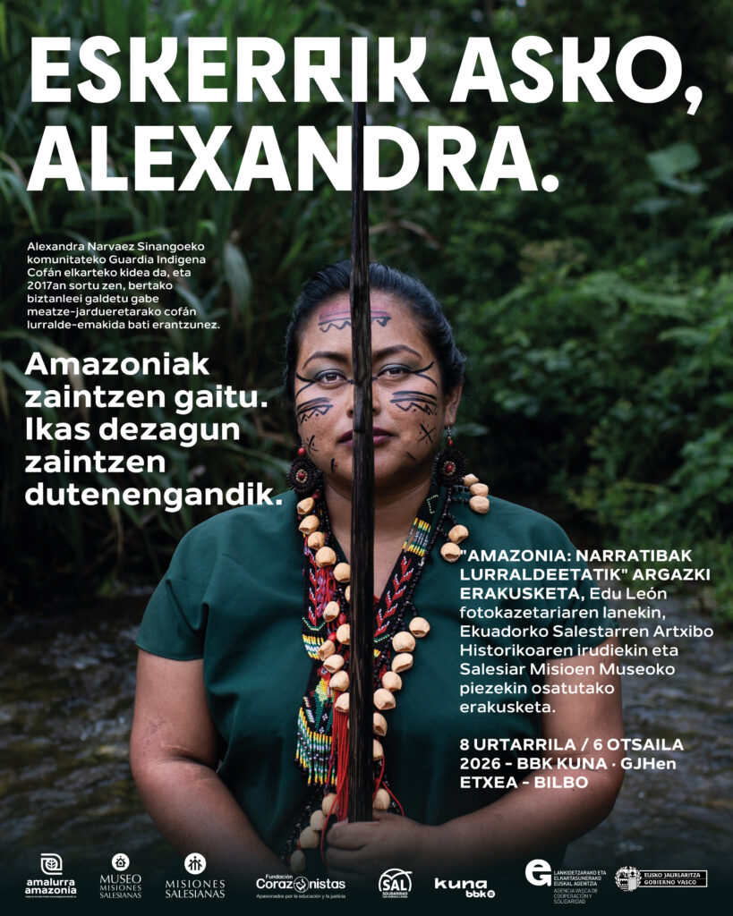 “Larrialdi klimatikoari aurre egiteko ikasgelak martxan” proiektua. Salesiako Misioen, Latinoamerikarekiko Elkartasunaren eta Corazonistas Fundazioaren “Orinoquiaren defendatzaileen feminismo dekolonialetik” garapen ereduaren alternatibak erakusketak “AMAZONIA, narratibak lurraldeetatik” argazki erakusketa dakar. Amazonia planetaren orekarako funtsezko lurralde gisa eta, aldi berean, bertan bizi diren herrien borrokarako eta erresilientziarako espazio gisa hausnartzera gonbidatzen duen ibilbide bisuala. Edu Leonek, Gurutze Gorria, ACNUR, Amnistia Internazionala eta Intermon Oxfam nazioarteko erakundeekin lan egin duen argazkilari espainiar ospetsuak, besteak beste, eskualdearen aberastasun natural, kultural, sinboliko eta politikoa erakusten digu bere begiradatik, bai eta aurre egiten dien mehatxuak eta hartzen dituen defentsa eta erresistentzia estrategiak ere, eta publikoa interpelatzen du bere defentsaren, babesaren eta aliantzak sortzearen premiaz.