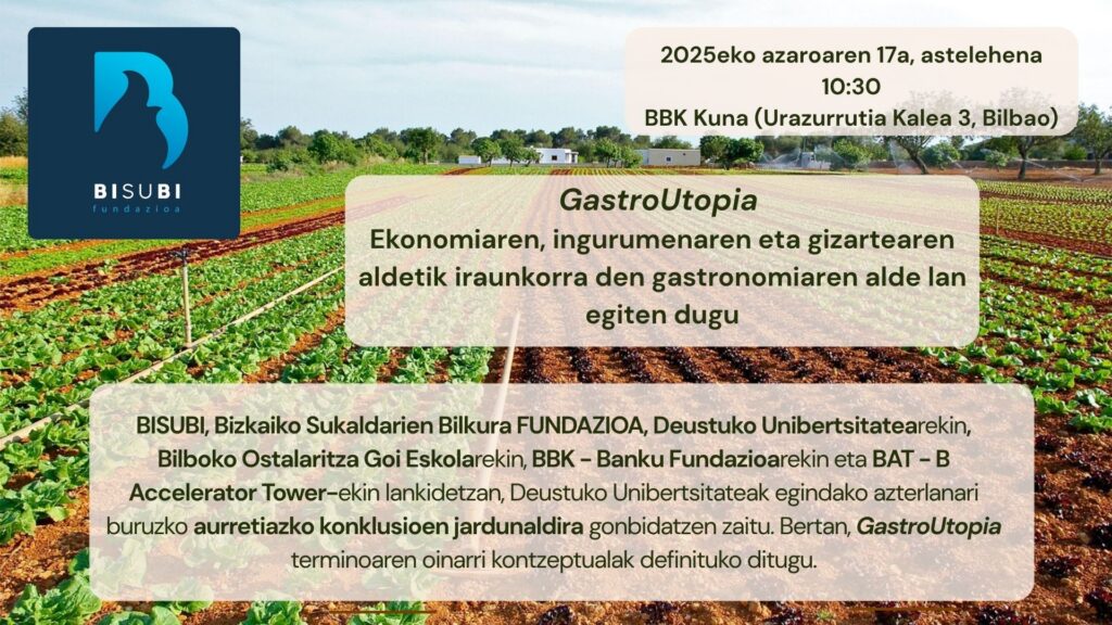 BISUBI, Bizkaiko Sukaldarien Bilkura FUNDAZIOA, Deustuko Unibertsitatearekin, Bilboko Ostalaritza Goi Eskolarekin, BBK – Banku Fundazioarekin eta BAT – B Accelerator Tower-ekin lankidetzan, Deustuko Unibertsitateak GastroUtopia terminoaren oinarri kontzeptualak definitzen lagunduko duen egindako azterlanari buruzko aurretiazko ondorioen jardunaldia egingo du.