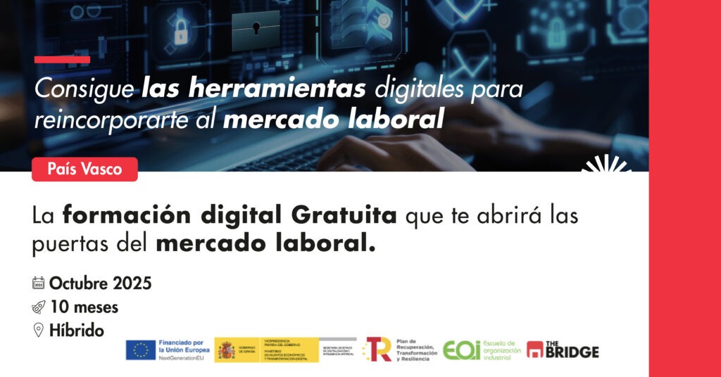 La oportunidad de formar parte del cambio está aquí con The Bridge. 100% financiado por la Unión Europea, con el respaldo de la Secretaría de Estado de Digitalización e Inteligencia Artificial (SEDIA) y EOI. ¡Conviértete en el profesional digital que las empresas necesitan!