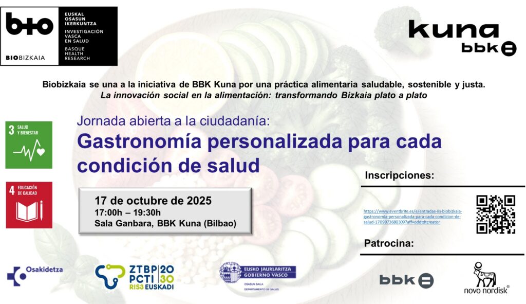 En este sentido, en el Instituto Biobizkaia nos unimos a la iniciativa de BBK Kuna por una práctica alimentaria saludable, sostenible y justa en 2025 “La innovación social en la alimentación: transformando Bizkaia plato a plato”. Y con el foco puesto en la salud, el Instituto Biobizkaia organizará la Jornada abierta a la ciudadanía: Gastronomía personalizada para cada condición de salud.